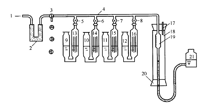 1、進氣管;2、干燥器;3、三通旋塞;4、梳形管;5、6、7、8、旋塞;9、10、11、12、緩沖瓶; 13、14、15、16、吸收瓶;17、溫度計;18、水套管;19、量氣管;20、膠塞;、21、水準瓶