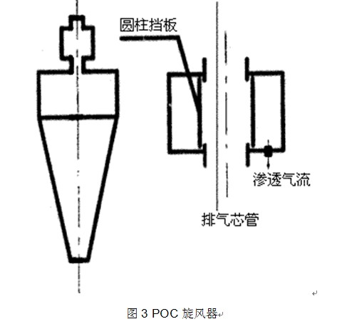 由于旋風(fēng)器對(duì)微細(xì)顆粒物效率較低,尤其對(duì) PM10( 粉塵粒徑小于 10μm 的顆粒物 ) 的除塵效率隨著顆粒直徑減小逐漸降低。也_是說,在旋風(fēng)器的運(yùn)行過程中,絕大部分微細(xì)粉塵穿透了分離區(qū)域,導(dǎo)致對(duì)微細(xì)粉塵效率下降。 A.Plomp 等 [3] ( 1996 年)提出了加裝二次分離附件的一種旋風(fēng)器,見圖 3 示意圖。二次分離附件設(shè)置在旋風(fēng)器本體頂部,稱之為 POC(post cyclone) 。
