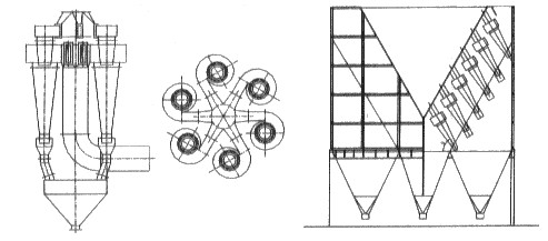 處理氣體量較大時,可以采用多個旋風(fēng)器單體進行并聯(lián)組合。( 1 )多筒組合:多筒組合可以采用分支并聯(lián)和環(huán)狀并聯(lián)方式,見圖 2 。組合技術(shù)的關(guān)鍵在于含塵氣流分配的均勻性和防止氣流串流。分支并聯(lián)一般采用雙旋風(fēng)器、四旋風(fēng)器方式。對于處理氣體量較大時,也可以采用母管分支并聯(lián)方式。分支旋風(fēng)器一般采用渦殼排氣方式。( 2 )多管組合:多管組合可以采用數(shù)十個旋風(fēng)子(小尺寸旋風(fēng)器)進行箱式并聯(lián)安裝。旋風(fēng)子在進氣箱體中可以采用順排并聯(lián)或錯排并聯(lián),采用慣性沉降一旋風(fēng)子兩級一體復(fù)合除塵參見圖 3 ,含塵氣流分配的均勻性可以通過調(diào)整旋風(fēng)子進氣口角度、排氣芯管長度、進氣空間高度、旋風(fēng)子間距等措施實現(xiàn)。