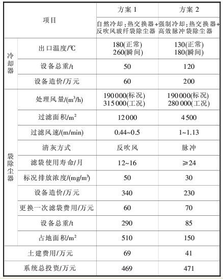 從表1可以看出,方案一中自然冷卻熱交換器的冷卻效率不及強(qiáng)制冷卻熱交換器;另外,由于熟料粉塵磨蝕性強(qiáng),玻纖袋抗磨蝕性差,抗折性差,其壽命通常僅一年,使用費(fèi)用高。方案二盡管設(shè)備投資要略高一點(diǎn),但其濾袋使用壽命長(zhǎng),占地面積小,對(duì)粉塵處理能力強(qiáng),能適應(yīng)大規(guī)格生產(chǎn),系統(tǒng)運(yùn)行參數(shù)優(yōu)于方案一。因此,我們推薦方案二為_(kāi)方案。