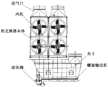 熱交換器由熱交換器本體、風(fēng)機(jī)、進(jìn)氣口、灰斗、螺旋輸送機(jī)和卸灰閥等構(gòu)成(見(jiàn)圖2)。高溫廢氣(250-450度)首_入熱交換器。熱交換器結(jié)構(gòu)為列管式,排出廢氣和冷卻空氣在其中的熱交換為非接觸式。軸流風(fēng)機(jī)產(chǎn)生的交叉氣流使列管內(nèi)外的冷熱氣體強(qiáng)制對(duì)流,通過(guò)冷卻風(fēng)機(jī)的單獨(dú)或成組啟動(dòng),可以將含塵廢氣冷卻到指定的溫度。