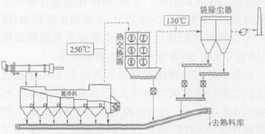 出冷機(jī)的高溫廢氣經(jīng)熱交換器降溫處理后,廢氣溫度由250度降至130度異常時(shí),廢氣溫度可由450度降至180度,再進(jìn)入布袋除塵器進(jìn)行收塵處理。同時(shí),熱交換器還可以起到沉降室的作用,預(yù)收下部分粉塵。其工藝流程見(jiàn)圖1